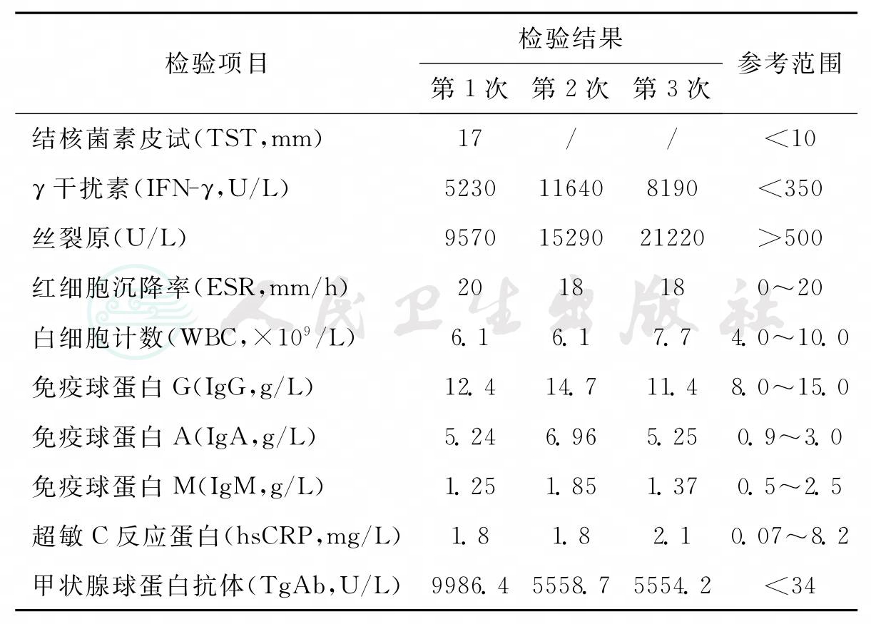 患者,女性,57岁。症状:参加年度结核潜伏感染筛检。既往史:接种过卡介苗。2005年,结核菌素皮试(TST)硬结直径<10mm,胸片示胸腔内钙化淋巴结(5mm)。2007年,参加年度结核潜伏感染筛检,初次TST(硬结直径17mm)和γ-干扰素释放试验(IGRAs,5230U/L)均阳性,免疫球蛋白A(IgA)增高,予左甲状腺素后有所减低并维持稳定。体格检查:无异常。其他检查:无异常。