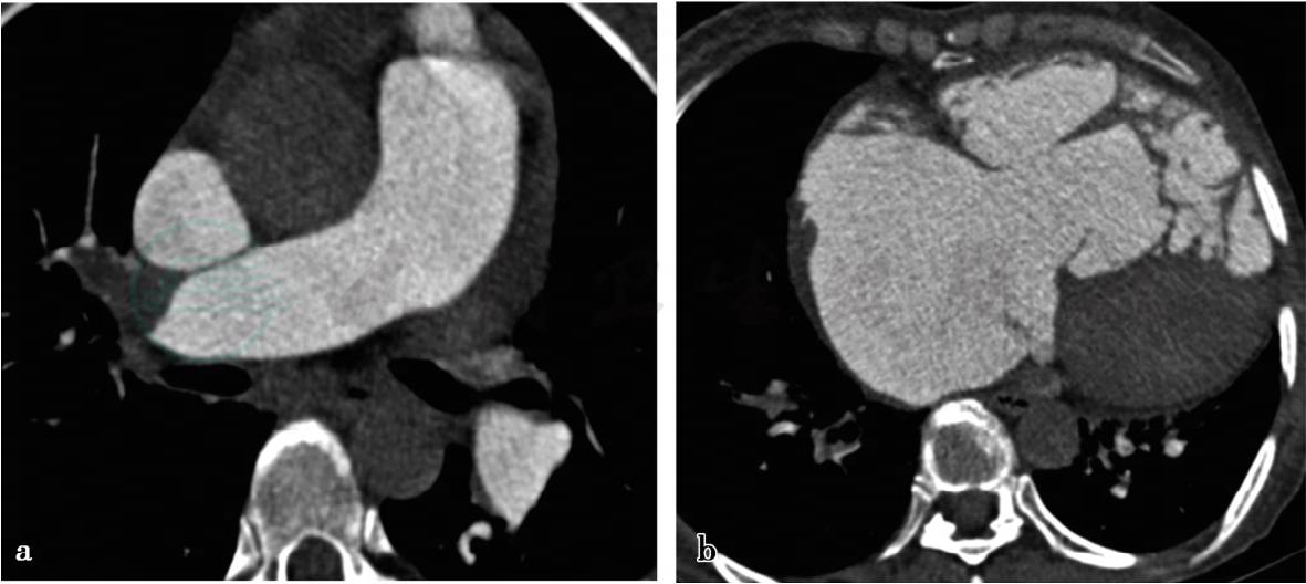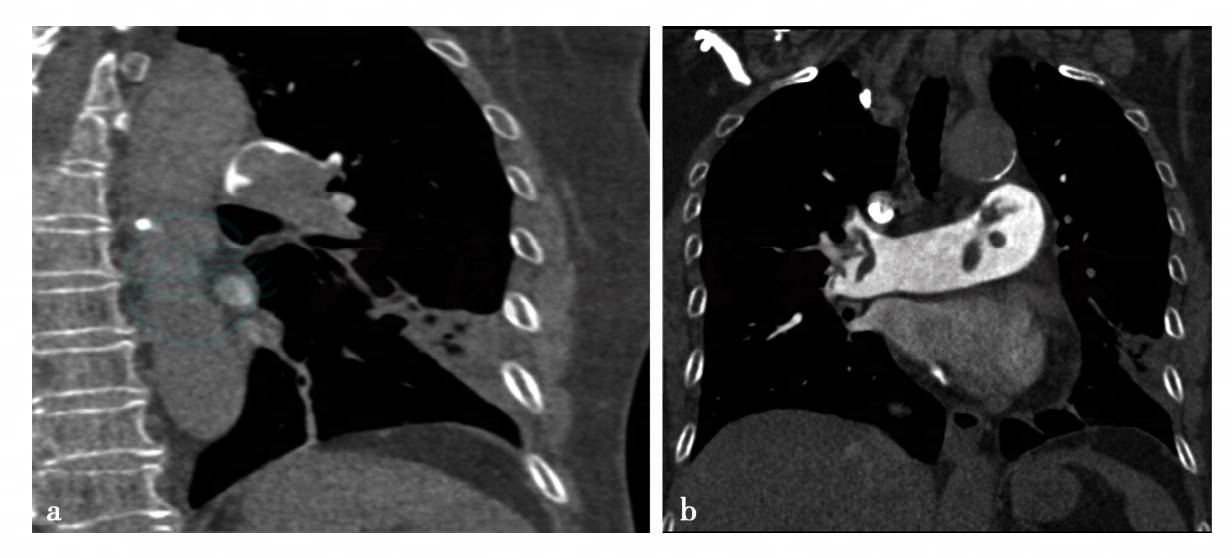 图2 图2a,双肺动脉多发低密度充盈缺损。图2b,肺动脉增粗,主肺动脉径约3.9cm,右心房、右心室明显增大