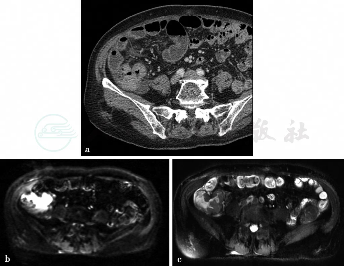 图1 图1a,CT增强静脉期图。图1b、c,分别为轴位T2WI及DWI图。升结肠肠壁增厚,轻度强化,MRI上呈稍长T2信号,DWI上为高信号