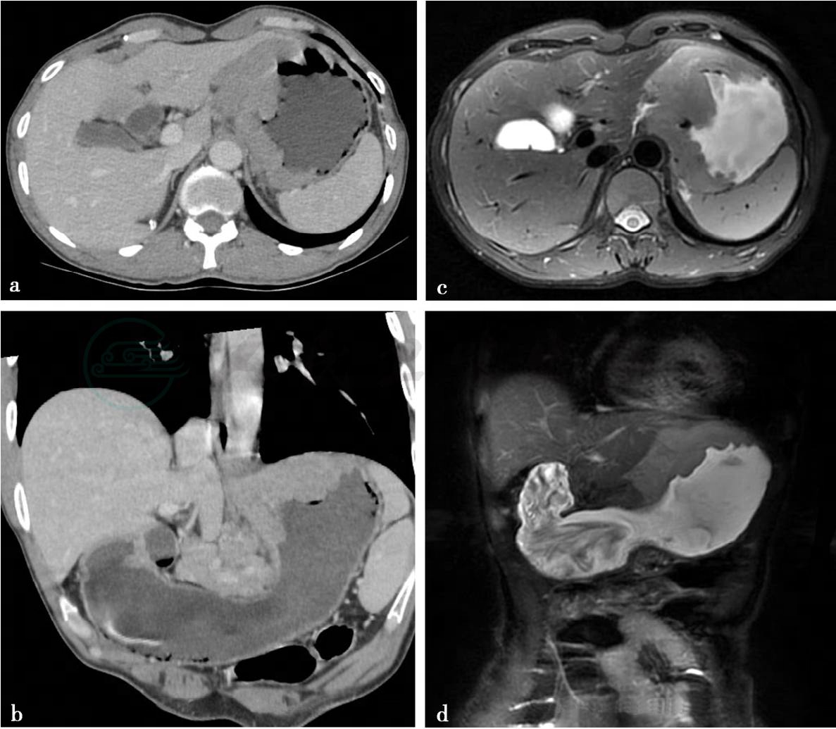 图2 图2a,CT增强静脉期。图2b,MPR重建图。图2c,轴位T2WI。图2d,冠位T2WI。贲门胃底可见广泛增厚,CT上轻度强化,MRI上呈稍长T2信号
