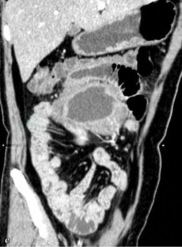 图1 图1a,CT平扫图。图1b,CT增强动脉期。图1c,MPR重建图。局部小肠肠壁增厚,但肠腔扩张可见气液平面
