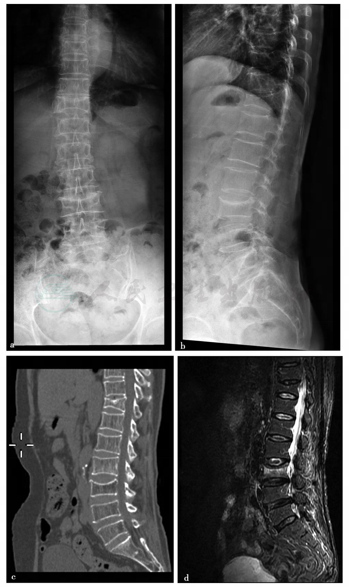 图1 图1a、b,腰椎正侧位T12椎体楔形变,L4椎体终板凹陷。图1c,腰椎CT平扫矢状位、冠状位三维重建。图1d,腰椎MRI(FST2WI)示T12椎体内未出现水肿信号,为陈旧骨折,L4椎体内见水肿信号,为新鲜骨折