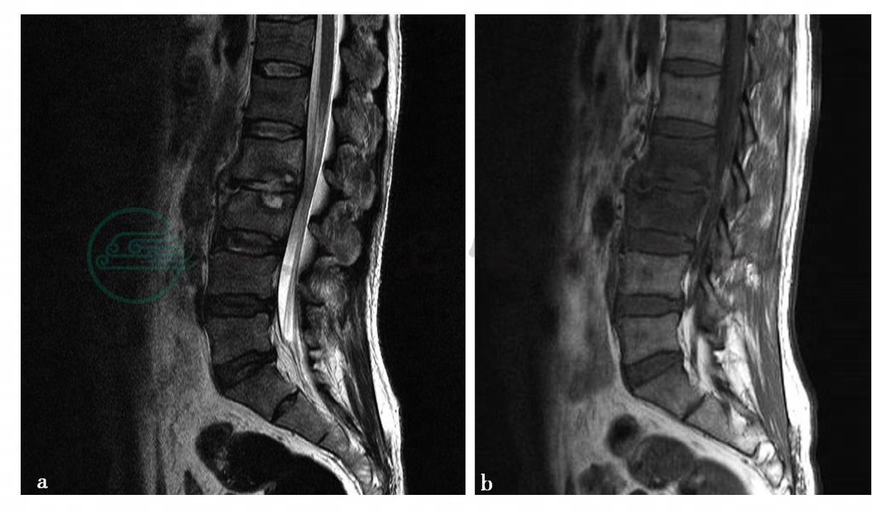 (2)病例2,男性,43岁。腰痛伴活动受限2个月余。1个月前出现午后低热(38℃左右),服用“板蓝根”后退热,午后低热持续约1周,之后未发热,现疼痛加重。体格检查:腰骶部压痛、叩击痛,腰部活动受限,无明显下肢放射。红细胞沉降率51mm/h,C-反应蛋白17.79mg/L。