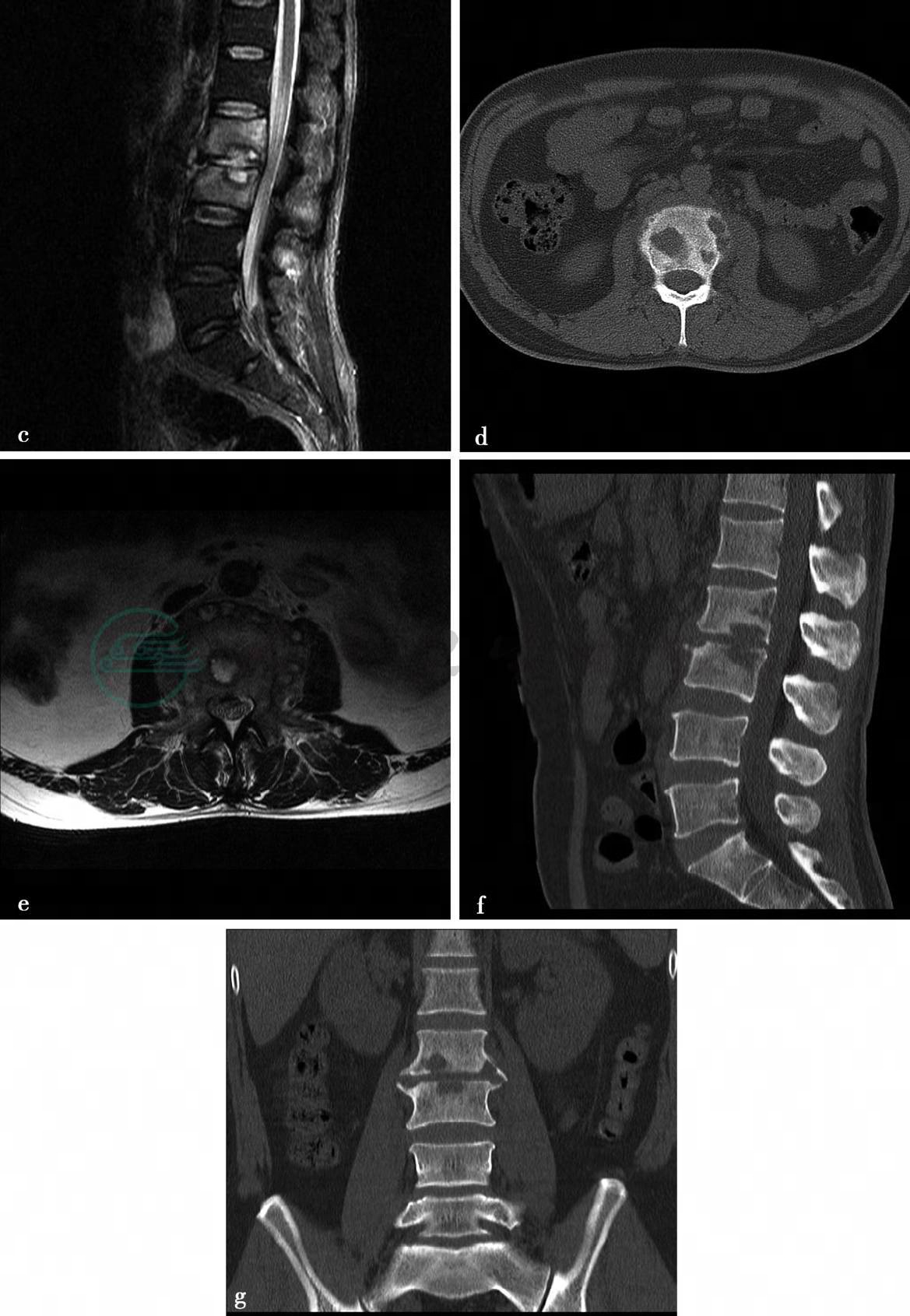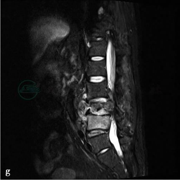 图1 a、c、d,CT平扫示矢状面重建图像显示腰椎生理曲度变直。L3椎体变扁,骨质破坏,呈碎片状改变,骨碎片向前后方向突出,导致骨性椎管变窄。L4椎体后上缘可见溶骨性骨质破坏,无硬化边。L3/4椎间隙变窄,L3椎体周围可见软组织肿胀,并波及左侧腰大肌。图17b,MRI示腰椎生理曲度变直。L3椎体显著变扁,骨质破坏,相应水平硬膜囊显著受压,在T2WI上脑脊液信号消失。L3/4椎间隙变窄。椎旁软组织肿胀,波及双侧腰大肌,形成脓肿,以左侧为主。图1e,L3/4椎体内可见片状T1WI低信号。图1f,T2WI呈等或低信号。图1g,STIR序列均呈高信号