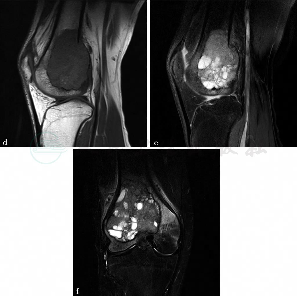 图3 图3d~f,MRI示右股骨远端膨胀性骨质破坏,边界较清楚,病灶组织向后侧略突出皮质外。图3d,病灶内容物在T1WI上呈低信号。图3e、f,在T2WI脂肪抑制像上呈略高信号,在远侧病灶内有多个圆形的更高小囊状信号影,无液-液平面。无明确骨膜反应