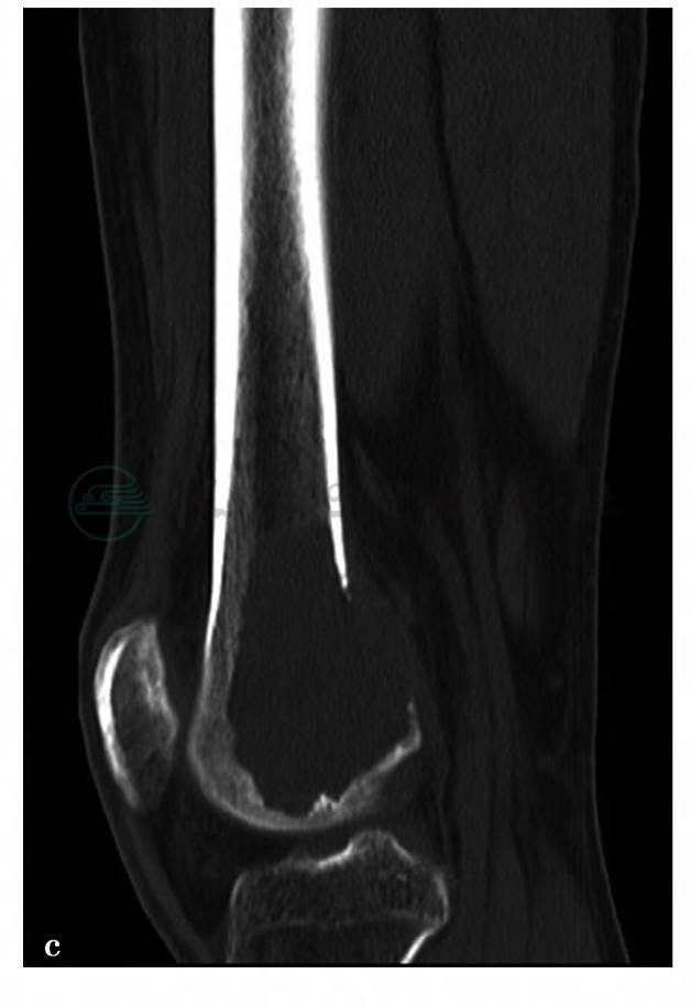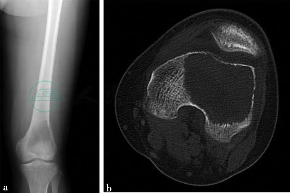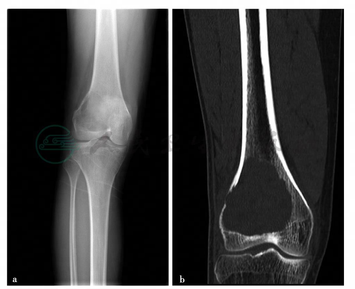 图2 图2a,X线示右股骨远端可见偏向股骨外侧髁的偏心性骨质破坏,病灶大小约6cm×6.5cm,边缘较清楚,无硬化边。病灶位于股骨远端,越过骨骺线,离关节面最近处约0.8cm。受累骨皮质完整,无骨膜反应。周围软组织清晰,无异常表现。图2b、c,CT示右股骨远端偏心性骨质破坏,病灶大小约6cm×6.5cm,略成膨胀性改变,边缘较清无硬化边,密度较均匀,CT值约35HU。后外侧骨皮质部分缺损,病灶内组织通过破损的皮质向后侧突出。无骨膜反应