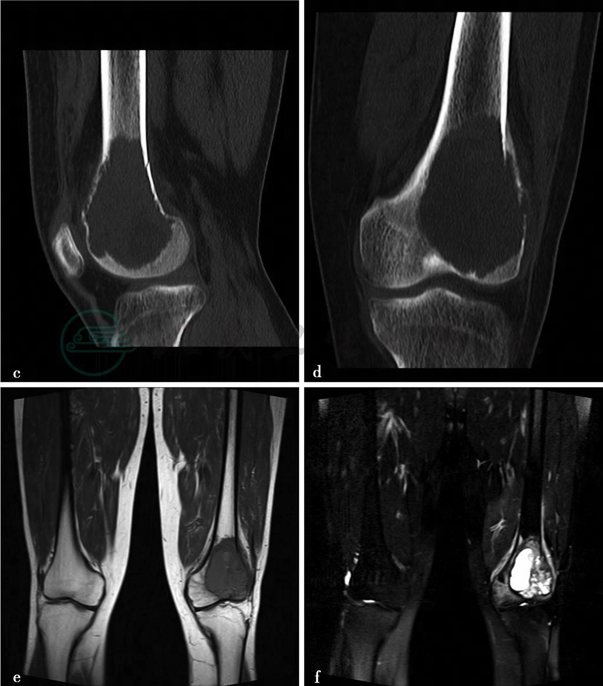 图1 图1a,X线示左股骨远端可见偏向股骨外侧髁的偏心性骨质破坏,病灶大小约6.3cm×7.9cm,边缘较清楚,无硬化边。病灶位于股骨远端,越过骨骺线,直达关节面骨皮质下,受累骨皮质完整。无骨膜反应。周围软组织清晰,无异常表现。图1b~d,CT示左股骨远端偏心性骨质破坏,病灶大小约6.3cm×7.9cm,略成膨胀性改变,边缘较清楚,无硬化边,密度较均匀,CT值约30HU。外侧骨皮质部分缺损,病灶内组织通过破损的皮质向外侧略突出,无骨膜反应。图1e、f,MRI示左股骨远端膨胀性骨质破坏,边界较清楚,病灶组织向外侧略突出于皮质外。图1e,病灶在T1WI上呈低信号。图1f,在T2WI脂肪抑制像上呈略高信号,其内有多个圆形的更高囊状信号影,其中一个较大,无液-液平面。无明确骨膜反应表现