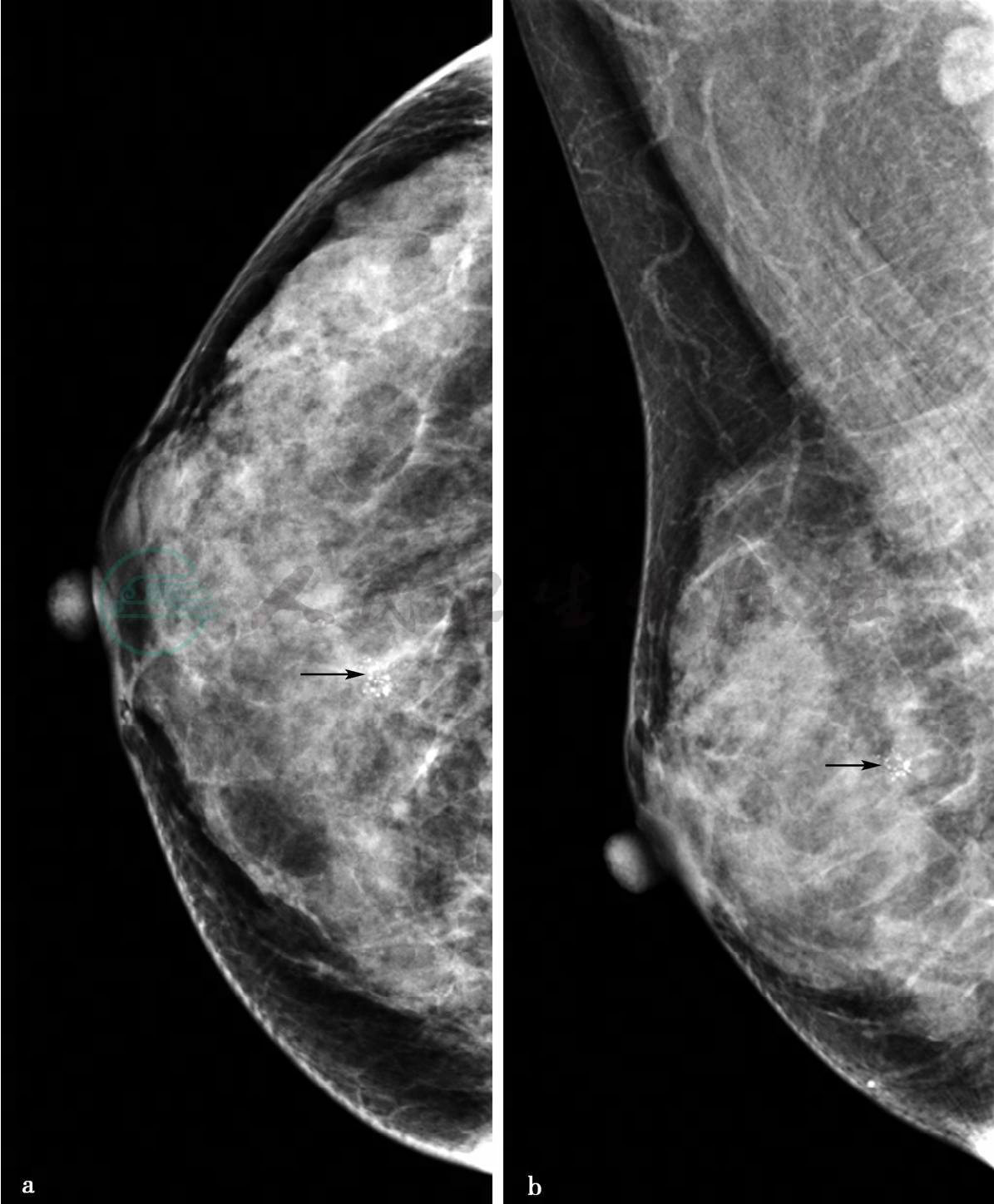 病例1,女性,42岁,常规检查于乳腺X线上发现右乳成簇钙化。体格检查:双侧乳房体积中等,无明显下垂,右乳腺内未触及明显肿物,皮肤和乳头正常,双腋下及锁骨上未触及肿大淋巴结。