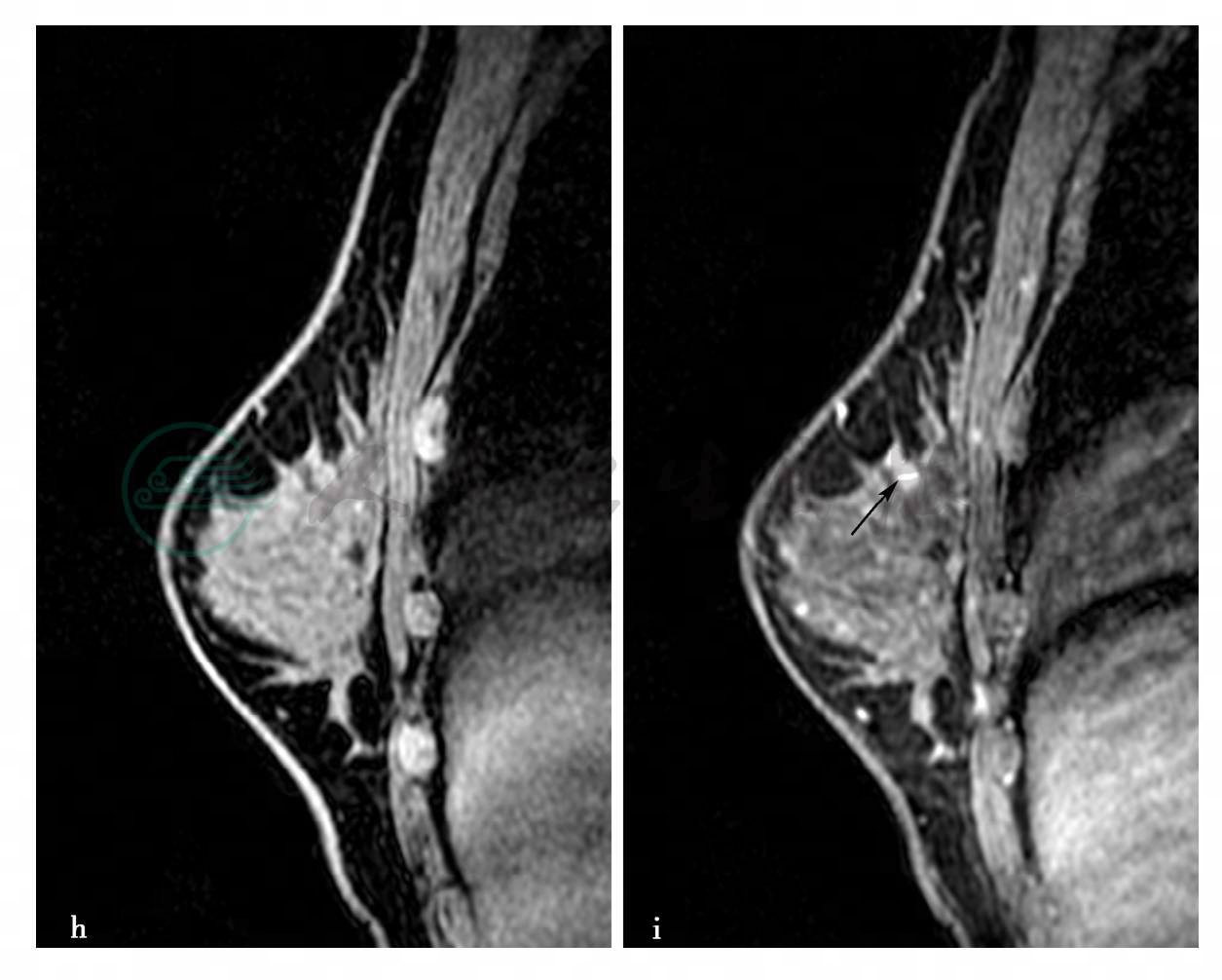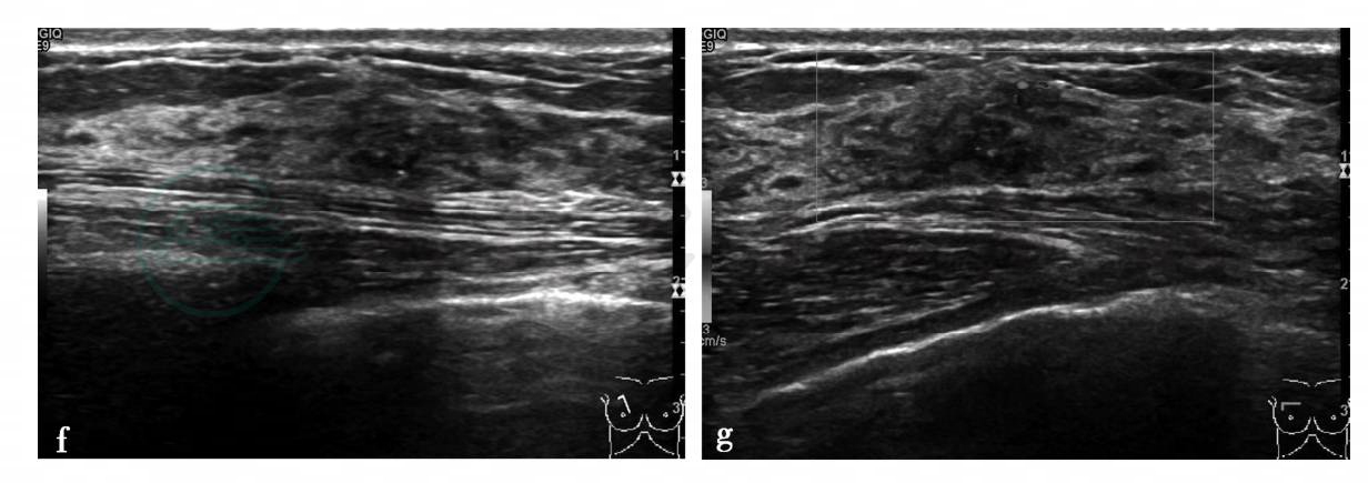 图2 图2f,右乳病变二维超声图。图2g,右乳病变彩色多普勒血流图。超声显示右乳稍内上方局限低回声区,范围约0.9cm×0.6cm,边界不清,内部回声不均匀,其内可见点状强回声。图2g,CDFI示可见较粗大血流信号