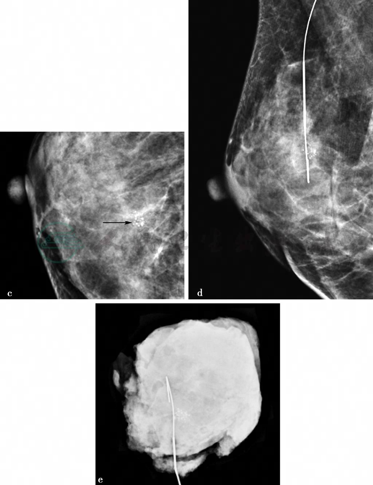 图1 图1a,右乳X线头尾位。图1b,右乳X线内外斜位。图1c,右乳X线头尾位钙化局部放大。图1d,X线导向下右乳钙化区域金属丝定位图像。图1e,右乳病变切除术后标本X线。X线显示双乳呈不均匀致密型乳腺,右乳内上方可见成簇不均质钙化,范围约0.8cm×0.7cm(图a、b、c箭头所示),其余未见明显异常