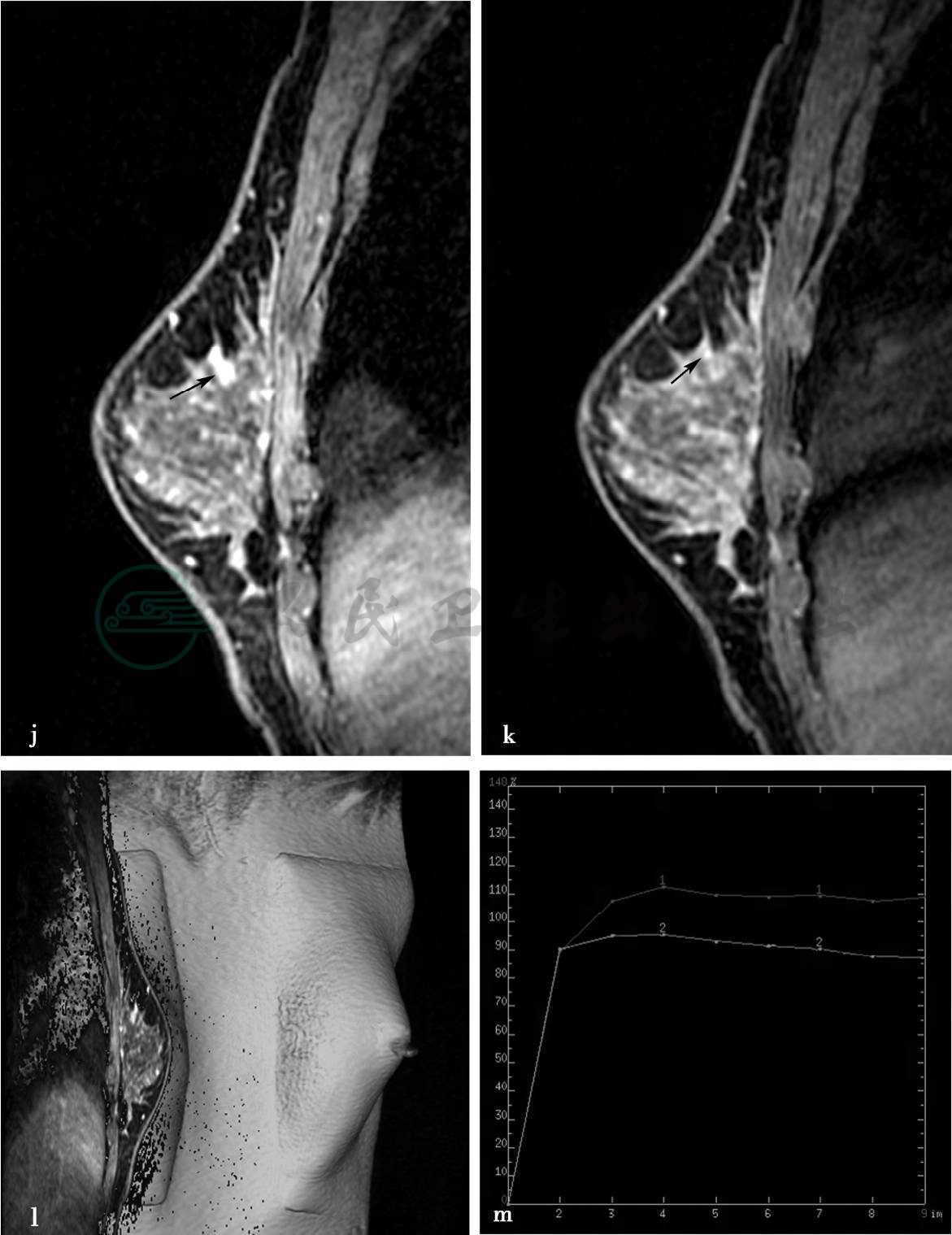 图3 图3h~k,分别为MRI动态增强前及增强后1min、2min、8min。图3l,MRI容积重建(VR)图(见文后彩图)。图3m,病变时间-信号强度曲线图。图3h~k,MRI显示右乳稍内上方(相当于X线片成簇钙化区域)局限异常强化病变,范围约2.8cm×2.3cm× 1.6cm。图3m,多点测量时间-信号强度曲线呈平台型和轻度流出型