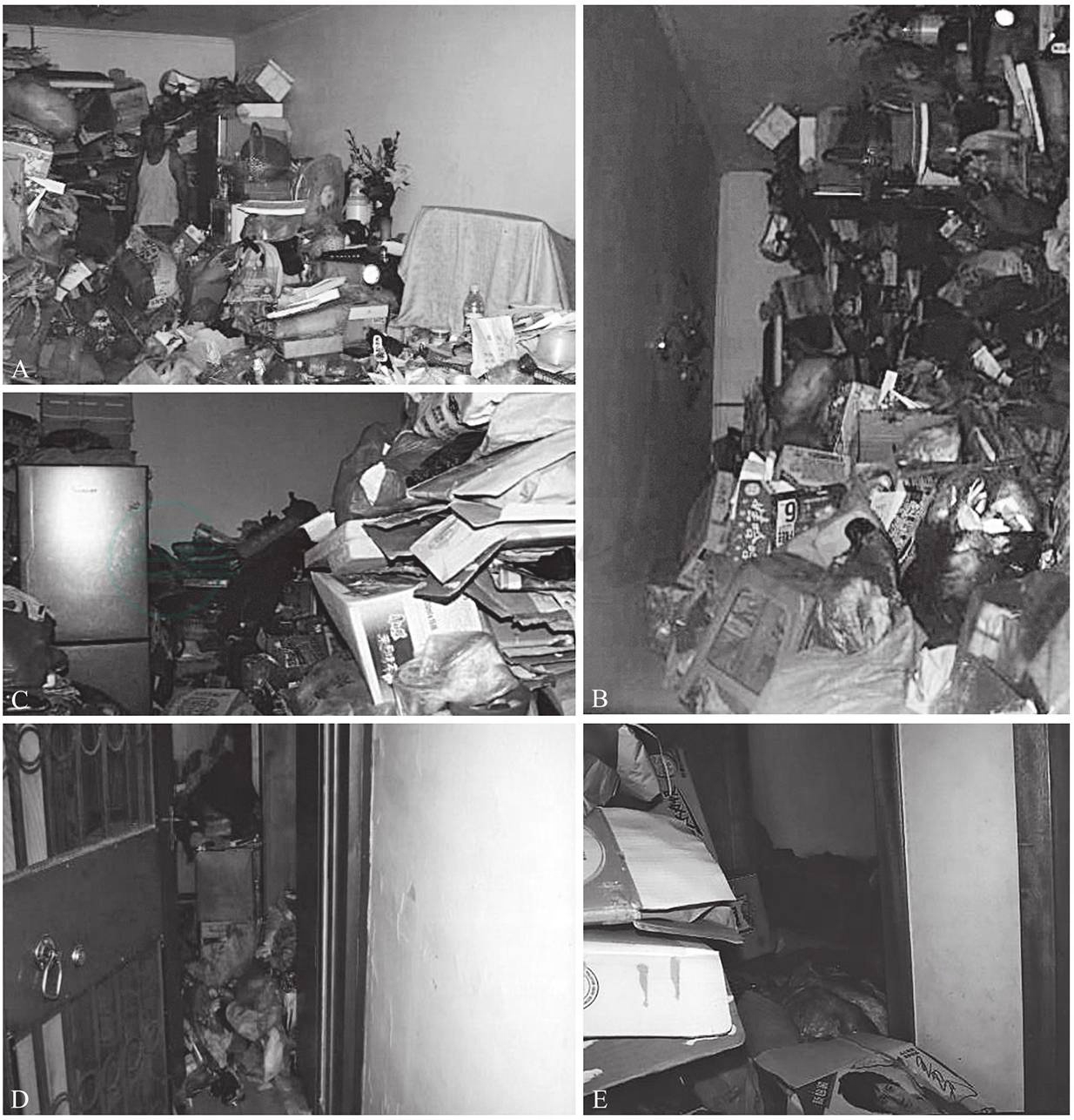 注:A.客厅中的电视机周围全是垃圾,全家人已很多年没办法看电视;B.房间内的垃圾堆得接近房顶;C.冰箱的门已被垃圾挤得无法打开;D.刚进房门,映入眼帘的就是满屋子垃圾,地上只能容下一只脚通过;E.卧室的桌子上也堆满了垃圾。