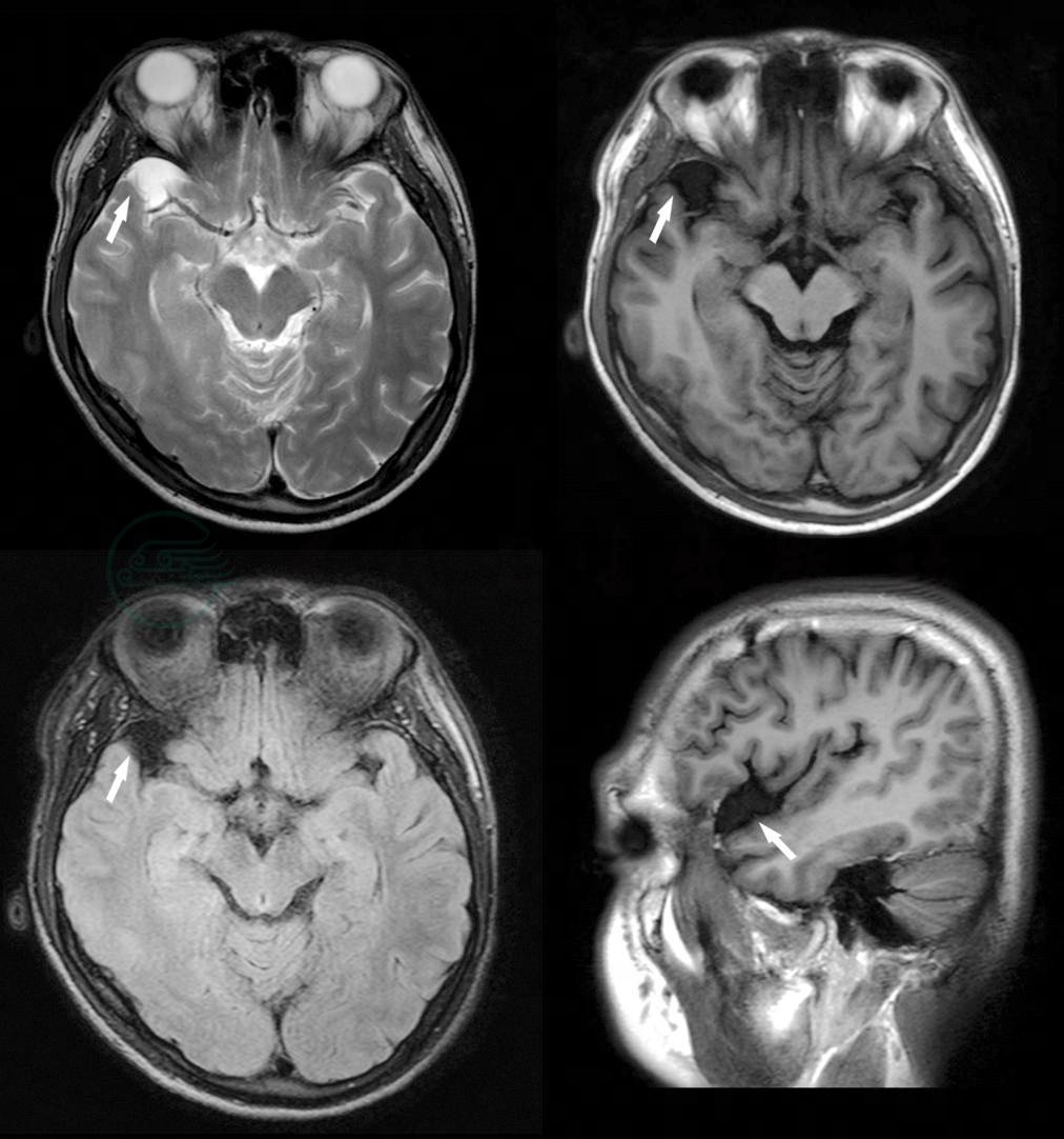 辅助检查:①三大常规、生化、甲状腺功能、催乳素、胸片、腹部彩超、心电图等检查未见明显异常。②脑电图“界限性脑电图:两半球基本波率为8~10Hz低-中幅α活动,以顶-枕区为主,双侧基本对称,调节、调幅较差,可见较多5~7Hz低-中幅波及活动,少量散在性低-中幅波,期间混杂较多低幅快波”。③头颅MRI检查提示:头颅形态大小如常,右颞部可见一囊状病变,大小约1.7cm×1.9cm×1.3cm,轻度占位效应,余脑实质内未见异常信号,侧脑室不对称稍扩大,余脑室、脑池、脑裂及脑沟对称,大小、形态正常,中线结构居中。脑干形态、信号未见异常。结果:颞部囊状病变,符合蛛网膜囊肿;脑室不对称扩大(图1)。
