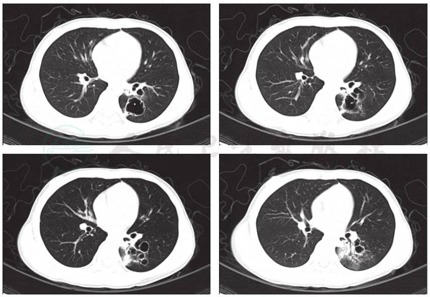 入院后立即予心电、血氧监护,完善相关检查。血常规:白细胞17.2×109/L;中性粒细胞70.8%;血小板496×109/L;红细胞4.6×109/L;血红蛋白132g/L;CRP 45.9mg/L;降钙素原0.15ng/ml。病原学检测:肺炎支原体抗体(MPAb)1:1280,肺炎支原体抗体-IgM阳性、鼻咽拭子肺炎支原体DNA测定阳性,肺炎衣原体抗体-IgM、结核抗体(TBAb)、常见呼吸道、肠道病毒及肝炎病毒检测均阴性,血细菌培养未见细菌生长,结核菌素试验阴性。胸部CT(图2):双肺散在炎症,左肺下叶多发薄壁空洞形成。白细胞升高明显,以中性粒细胞增高为主,CRP亦增高,肺炎支原体阳性,予盐酸头孢吡肟联合乳糖阿奇霉素静脉滴注5天抗感染。