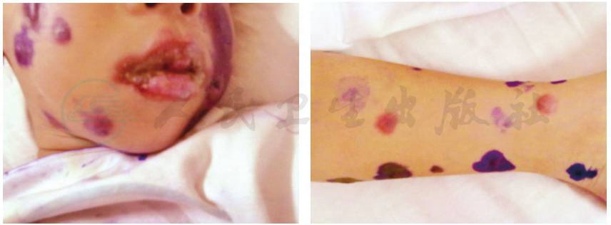 入院查体及相关检查:精神萎靡,状态反应差。口周、口腔内部、舌溃烂,并有黄白色分泌物渗出。双眼较多分泌物,睁眼费力,颜面及周身皮肤散在分布红色不规则皮疹,部分皮疹中央坏死,以躯干部明显,皮疹直径1~5cm之间(图1),无痒感。尼氏征阳性,浅表淋巴结未触及肿大。呼吸平稳,无鼻翼扇动及三凹征,双肺听诊呼吸音粗,双肺可闻及散在水泡音及痰鸣音,心、腹及神经系统查体未见异常。