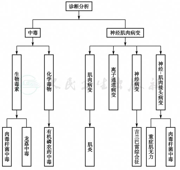 重症肌无力:患者横纹肌群肌力有波动性和易疲劳的特点,眼外肌常受累,症状呈晨轻暮重,新斯的明试验阳性,根据此病例特点,不考虑重症肌无力及有机磷中毒。