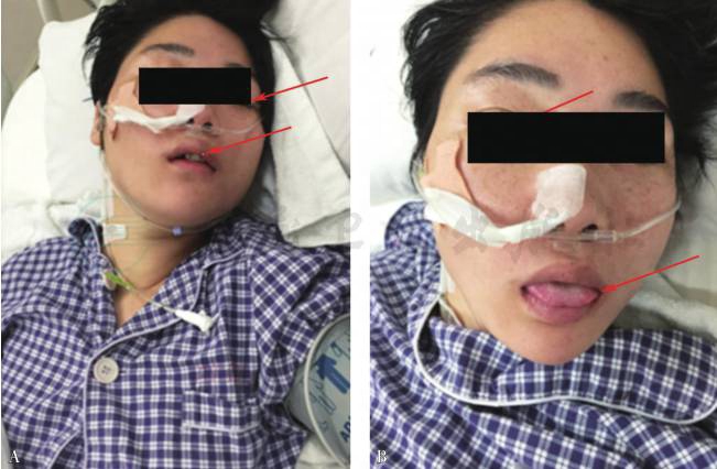 A为治疗前,双睑下垂,伸舌无力;B为治疗后,可睁眼、伸舌