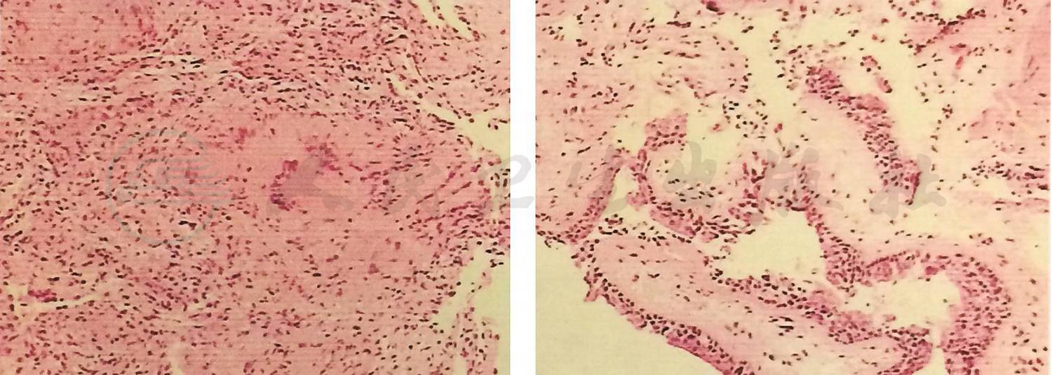 2.支气管镜+右下肺支气管镜下肺活检 镜检诊断为支气管炎,右下叶背支病检为肉芽肿性炎,考虑结核(图3)。