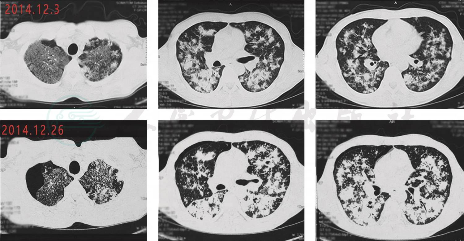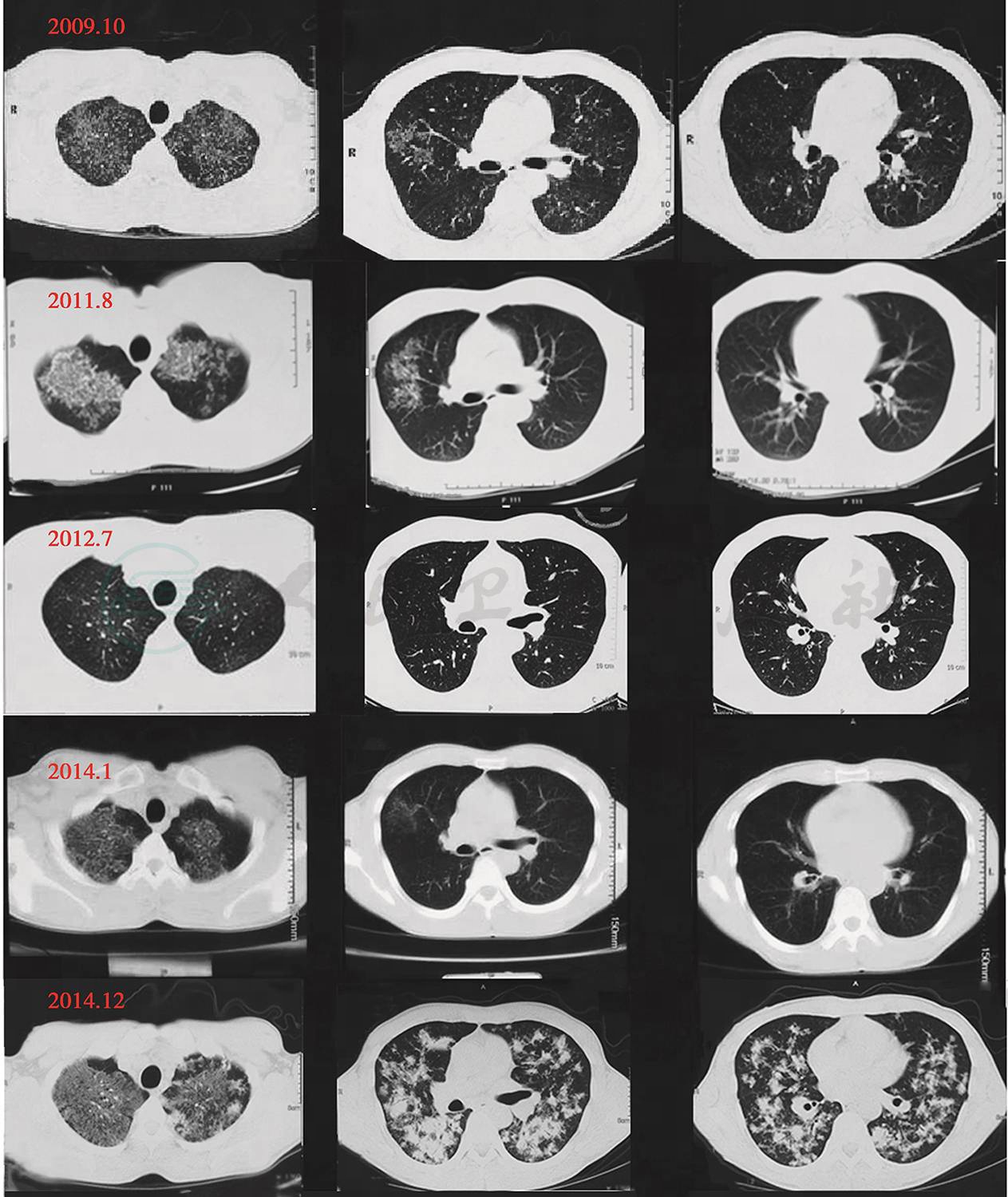 患者于2009年受凉后出现阵发性咳嗽,为干咳,晨起、进食时加重,约持续1min,每天4~5次,无呼吸困难、胸痛、咳痰、咯血、乏力等症状。于当地医院诊断为肺结核予以抗结核四联+护肝规律治疗7个月,因症状无缓解入住当地医院15天予以抗结核治疗(具体用药不详),症状未有明显缓解,于2011年11月始以中药抗结核治疗4个月,并于2012年7月复查CT(图1)示胸部病变较前好转,原双上肺斑片状、片状密度增高影基本吸收,双上肺可见散在小结节状密度增高影。患者自觉症状无明显缓解或加重,咳嗽症状反复,为求进一步诊治于2014年1月来我院,胸部CT(图1)结果及临床考虑诊断为肺泡蛋白沉着症,因患者自身因素未进一步治疗。2014年10月始患者无明显诱因出现活动后气促,吸气期及呼气期均感呼吸费力、呼吸频率增快、深度变浅,伴胸痛、乏力、盗汗。2014年12月初出现咳痰,为白色黏痰,多发生在夜间。咳嗽持续时间及频率均增加。为求进一步诊治来我院复查胸部CT(图1)示双上肺病变密度增高较前增大,双肺多发结节状密度增高影较前增多,纵隔多发淋巴结增大。于2014年12月15日入住我科,患者自起病以来,精神食欲可,睡眠可,小便较少,大便正常,2个月体重下降约5kg。