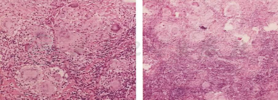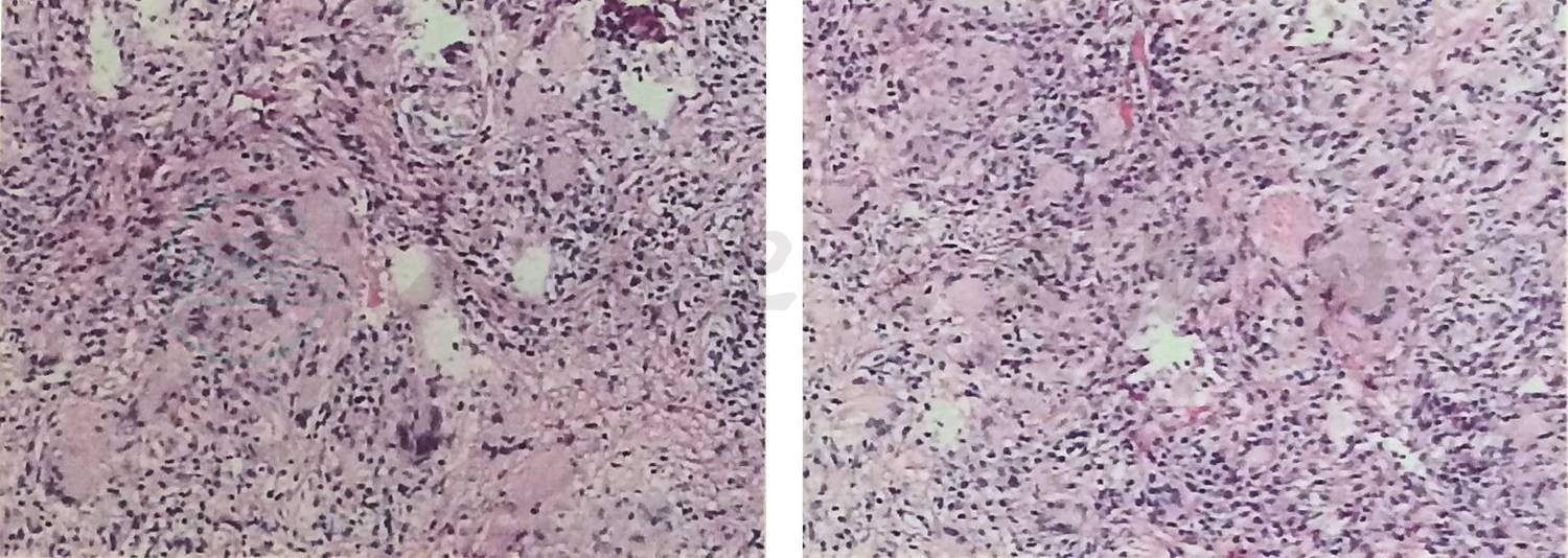 1.左锁骨上淋巴结活检病理 肉芽肿形成,倾向结核(图2)。