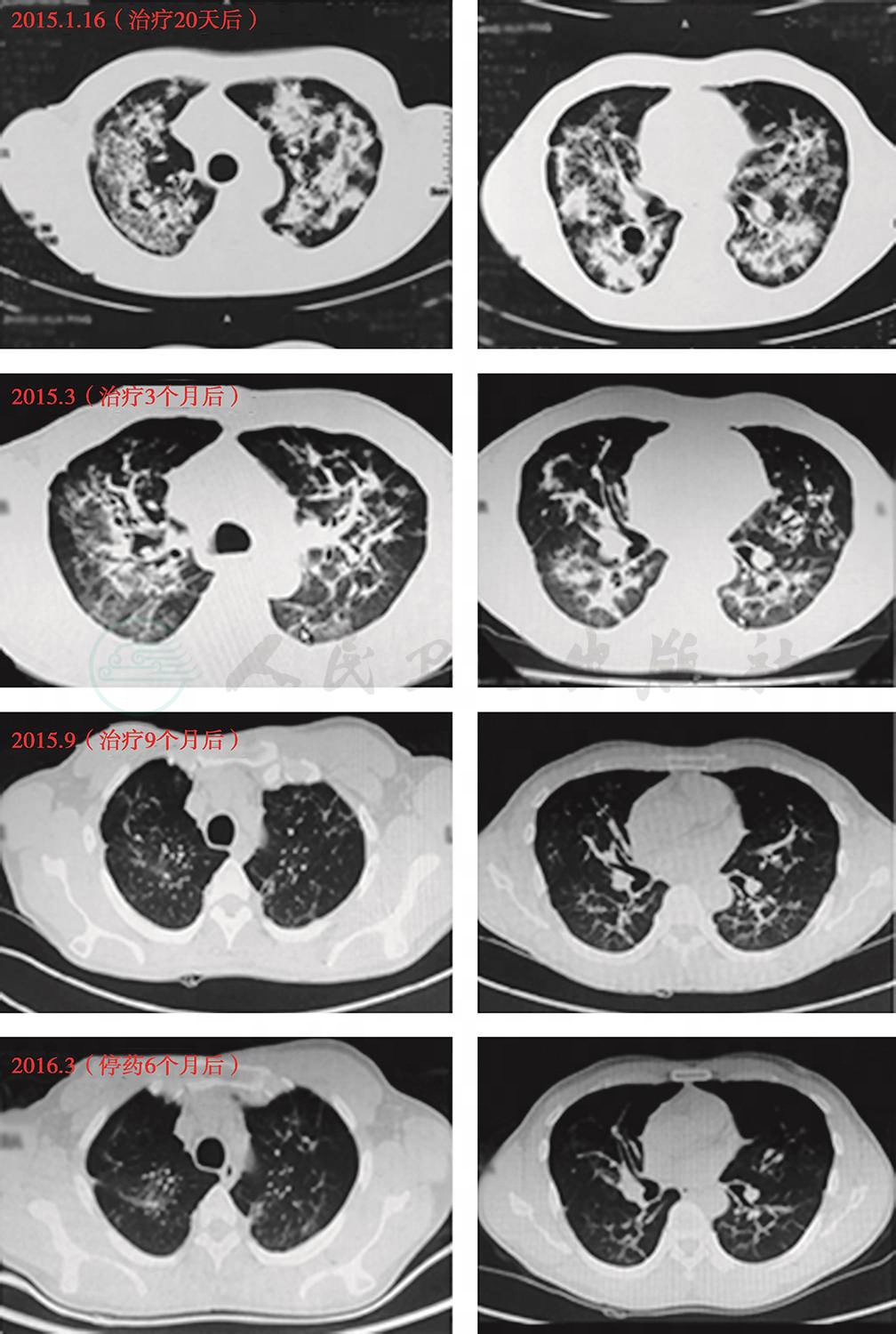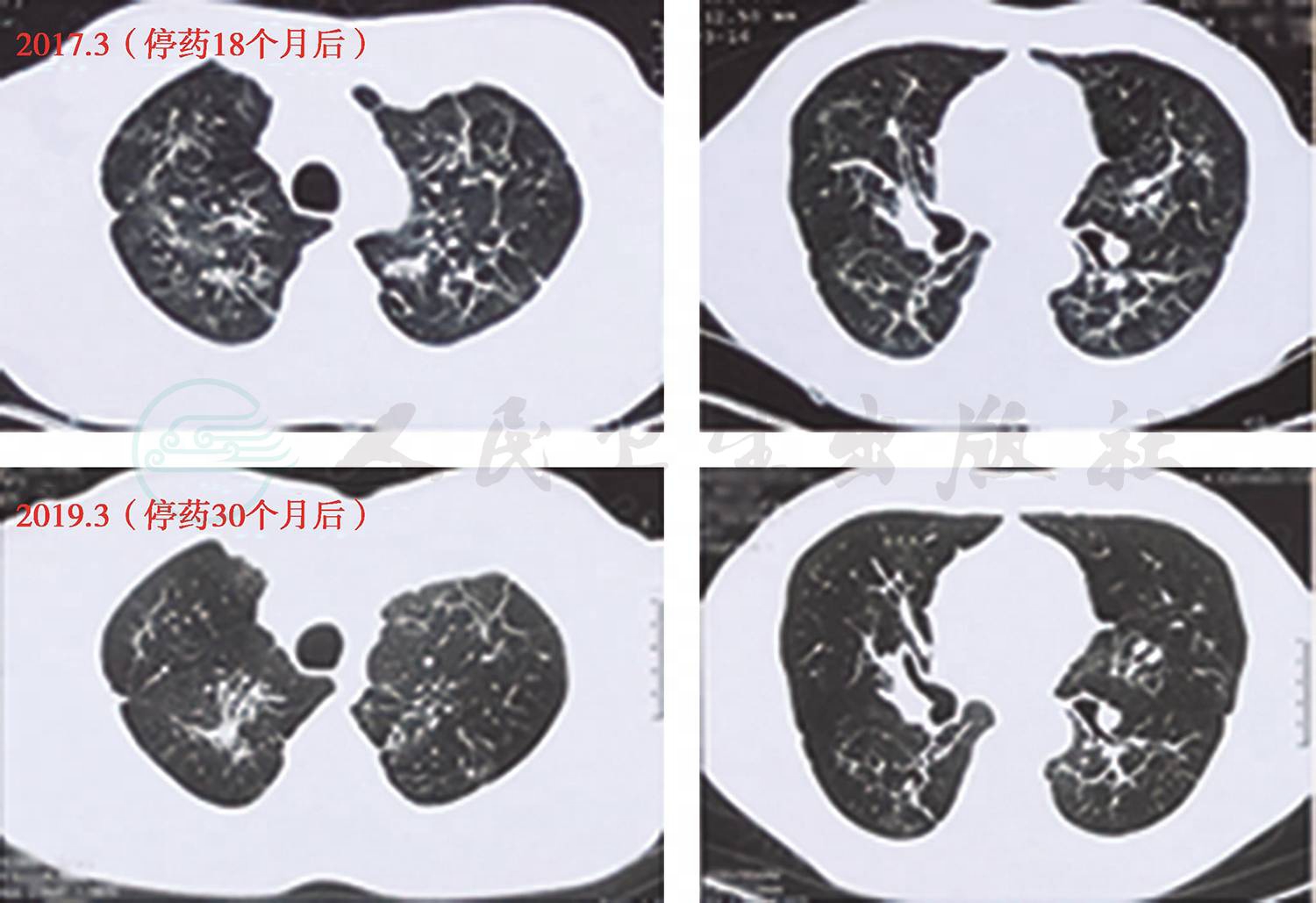 患者抗真菌治疗后,咳嗽、呼吸困难等症状明显缓解,肺部影像学病变明显好转(图6)。随访4年,患者除仍有轻微咳嗽外,无其他呼吸道相关症状。