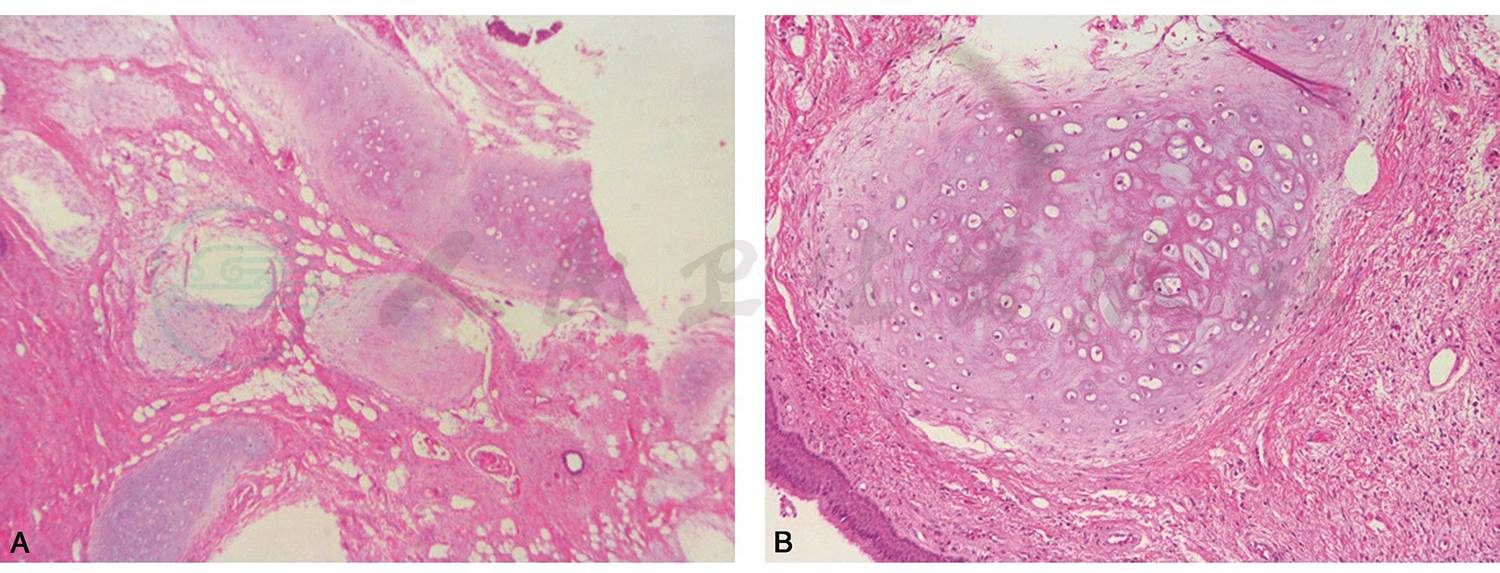 图4 支气管镜下治疗切割组织送病理:HE染色(A:×4,B:×10)可见支气管上皮和中胚层的多种成分异常混合而形成的结节状肿块。其中含有多量软骨、脂肪和纤维组织,提示支气管错构瘤