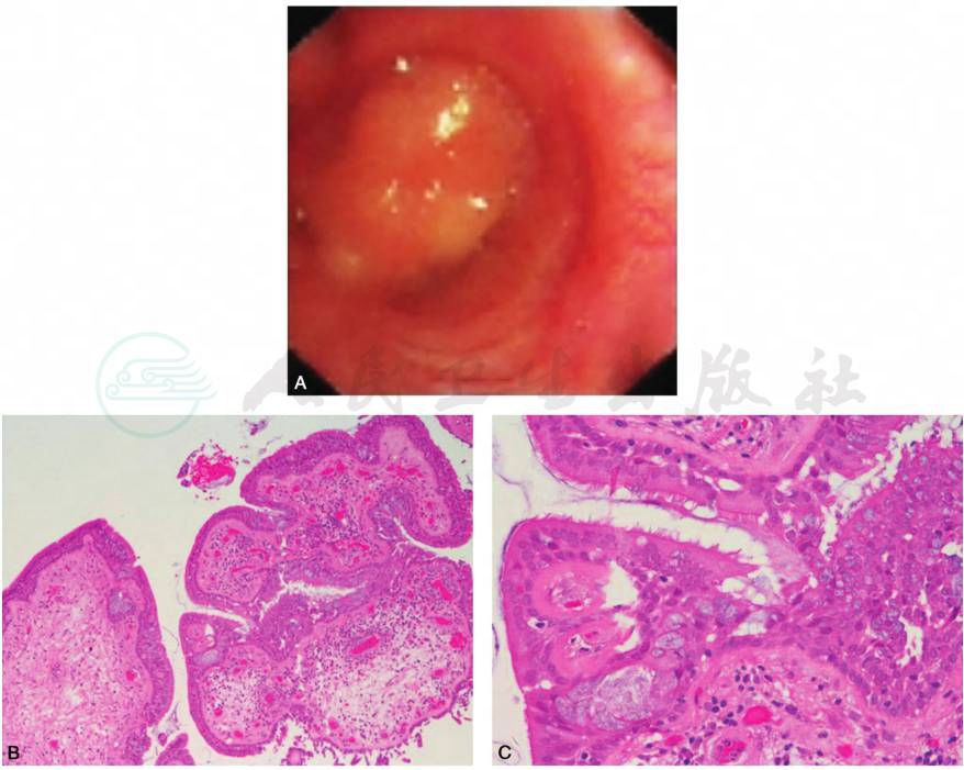 图2 支气管镜检查可见左主支气管距隆突2cm处新生物阻塞管口,表面光整(A);病理HE染色(B:×10,C:×40)提示病灶由结缔组织基质所构成,表面被覆纤毛柱状上皮和间变的鳞状上皮细胞,考虑支气管乳突状瘤