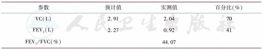 肺功能报告:总呼吸道阻力增高,轻度限制性通气功能障碍,重度阻塞性通气功能障碍,小气道重度陷闭,肺弥散功能重度降低。支气管舒张试验:吸入支气管舒张剂15分钟后,FEV1:升高11%(100ml),支气管舒张试验阴性(表1)。