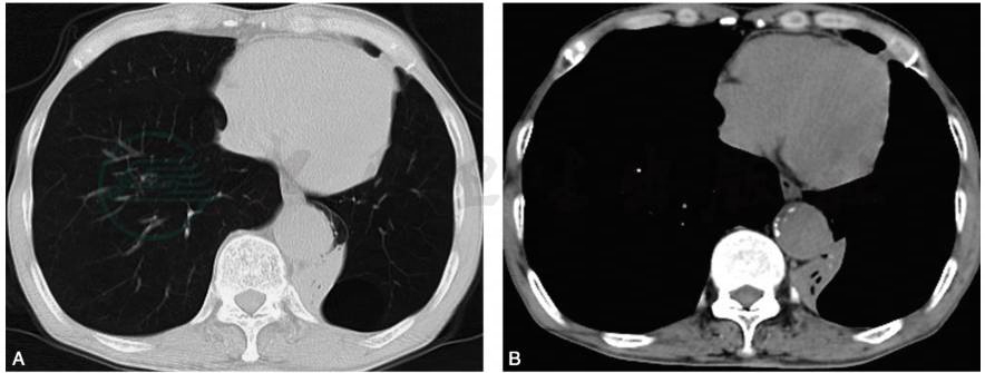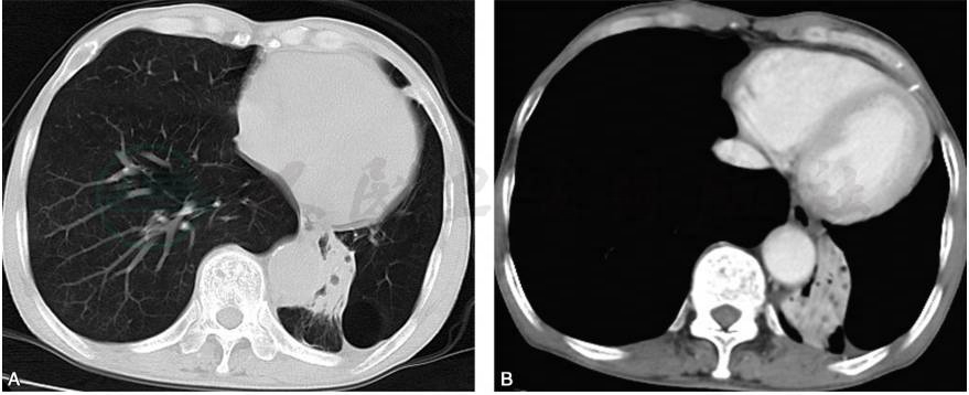 患者男性,75岁,主因“咳嗽、咳痰伴活动后气促2年余,加重半年”入院。患者2年前无明显诱因出现活动后气促,冬季明显;偶有咳嗽、咳痰,清晨痰量较多,偶有低热,体温未测;无畏寒、恶心、呕吐、头痛等不适;爬楼等活动后气促加重,休息后可缓解;曾于当地多次住院治疗,具体情况不详。近半年活动后气促症状较前加重,与体位有关,侧卧明显。于当地医院就诊未见明显好转,为求进一步治疗,收入我科。患病以来精神可,胃纳、睡眠正常,大小便正常,无体重明显下降。