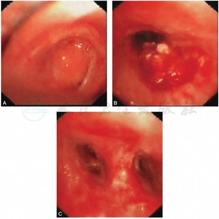 1.支气管镜下氩气刀结合电圈套治疗(图3) 患者左主支气管新生物通过镜下治疗后左肺上叶及下叶8、9、10段开口显露,亚段通畅,下叶背段仍有新生物,但患者后期难以耐受治疗故终止。切割组织再次送检病理。