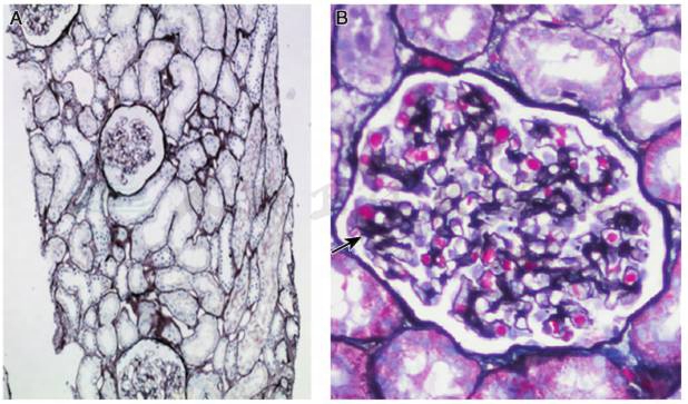 图2 肾功能正常的抗GBM病:肾小球、肾小管、肾间质和小动脉无明显病变,仅见肾小球系膜细胞和基质轻度增生(A:PASM×100,B:PASM+Masson×400)