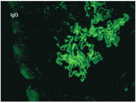 图1 肾功能正常的抗GBM病:IgG呈细线状沿肾小球毛细血管壁沉积(免疫荧光×400)