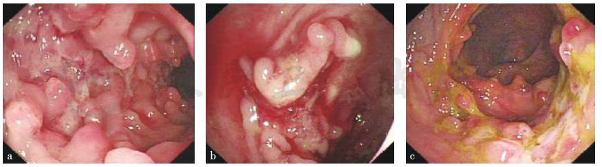 2012年6月、2014年9月及2015年5月,复查肠镜3次,见全结肠多发不规则溃疡,息肉样增生及肠腔狭窄。肠镜下活检病理见“小肉芽肿”“节细胞增生”。2014年9月23日肠镜检查显示,全大肠见多量息肉样、结节样增生及多量大小、形态不一的溃疡,其中直肠、乙状结肠交界见一纵行溃疡,直肠距肛门3cm处见一深凿样溃疡,肛门截石位9点处见一外瘘口(图2)。