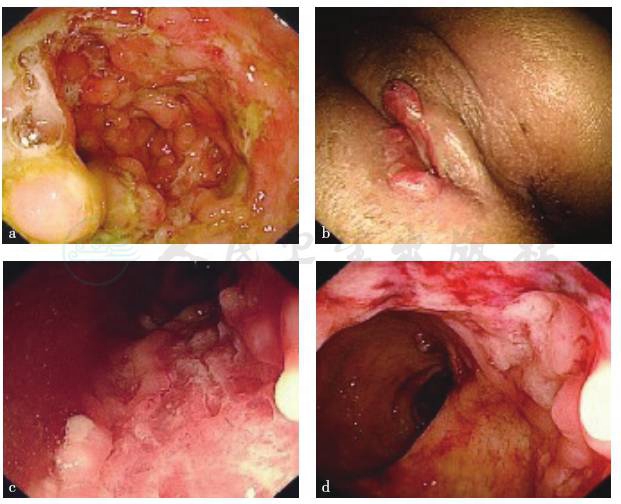 a. 回盲部;b. 肛瘘;c. 直乙交界;d. 直肠