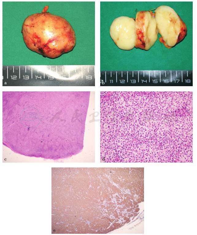 a. 淋巴结大体,淋巴结包膜完整;b. 淋巴结大体,切面呈鱼肉状;c. 淋巴结正常结构破坏,异型细胞弥漫浸润(HE染色,20×);d. 异型淋巴样细胞体积较大,胞质丰富,核卵圆形(HE染色,100×);e. 免疫组化CD20异型细胞弥漫阳性(20×)