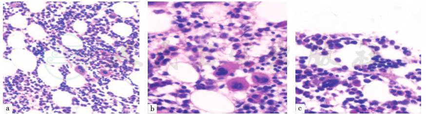 穿刺骨髓组织增生大致正常,可见三系造血细胞,均以偏成熟阶段为主,粒红系比例稍减少,可见分叶核巨核细胞,未见明确肿瘤浸润,需结合临床表现判断。免疫组化示:髓过氧化物酶(myeloperoxidase,MPO)髓系细胞(+),CD5、CD3示散在分布小淋巴细胞(+),CD79a、CD20示散在分布小淋巴细胞(+)。