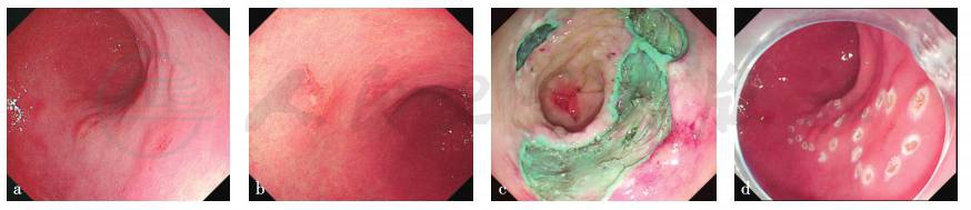 (1)于2017年8月2日行胃ESD治疗。术中,胃窦前壁近小弯侧、大弯侧、大弯侧近后壁、后壁各见一片状糜烂,分别行ESD(图1)。