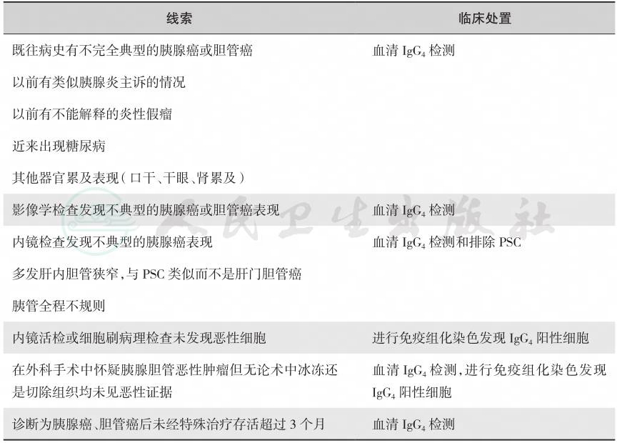 既往病史有不完全典型的胰腺癌或胆管癌 血清IgG4检测 以前有类似胰腺炎主诉的情况 以前有不能解释的炎性假瘤 近来出现糖尿病 其他器官累及表现(口干、干眼、肾累及) 影像学检查发现不典型的胰腺癌或胆管癌表现 血清IgG4检测 内镜检查发现不典型的胰腺癌表现 血清IgG4检测和排除PSC 多发肝内胆管狭窄,与PSC类似而不是肝门胆管癌 胰管全程不规则 内镜活检或细胞刷病理检查未发现恶性细胞 进行免疫组化染色发现IgG4阳性细胞 在外科手术中怀疑胰腺胆管恶性肿瘤但无论术中冰冻还 是切除组织均未见恶性证据 血清IgG4检测,进行免疫组化染色发现 IgG4阳性细胞 诊断为胰腺癌、胆管癌后未经特殊治疗存活超过3个月 血清IgG4检测 |