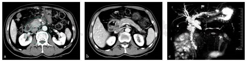 现病史:患者于5年前(2012年1月)进食油腻食物后出现上腹痛(腹痛性质为钝痛,程度中等,呈持续性),就诊于当地医院,查血清淀粉酶650U/L,诊断为“急性胰腺炎”,予保守治疗后腹痛缓解。2013年11月患者无明显诱因再次出现上腹痛,性质同前,当地医院查血清淀粉酶350U/L,诊断为“急性胰腺炎”,予保守治疗后缓解。2015年8月患者在旅途中无明显诱因再次出现上腹痛,程度较剧,为持续性,当地医院诊断“急性胰腺炎”、“胆囊结石伴急性化脓性胆囊炎”,按胰腺炎治疗1周并行腹腔镜胆囊切除后出院。2015—2017年,患者偶有上腹饱胀不适,未治疗,定期行上腹部CT平扫+增强扫描或MRI随访,无特殊异常发现。2017年4月,患者于当地医院复查上腹部CT平扫+增强扫描及MRCP均提示胰头占位,遂于2017年6月来我院就诊,再次行上腹部CT平扫+增强扫描及MRCP,均提示胰头占位可能,胆总管下段截断,胰管、胆总管扩张。2017年6月患者在我院门诊行EUS,提示胰头占位,主胰管、胆总管扩张,腹腔多发淋巴结肿大。患者为进一步诊治于2017年6月30日在我科住院治疗。