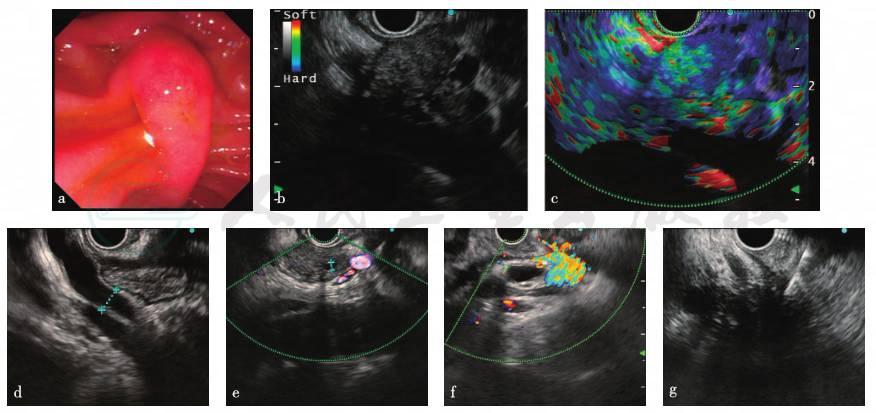 a. 十二指肠乳头;b. 胰腺头部占位;c. 胰腺头部占位弹性成像;d. 主胰管;e. 胆总管;f. 腹腔多发淋巴结;g. FNA穿刺