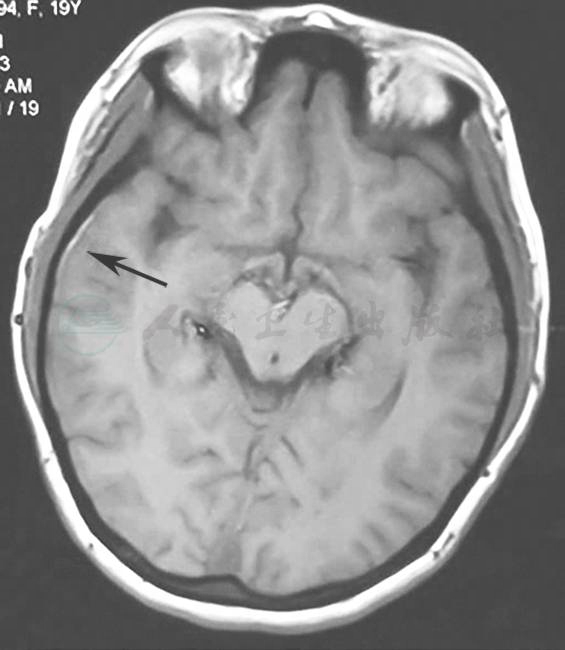 黑色箭头指示T1序列右侧颞叶边缘高信号,可疑蛛网膜下腔出血