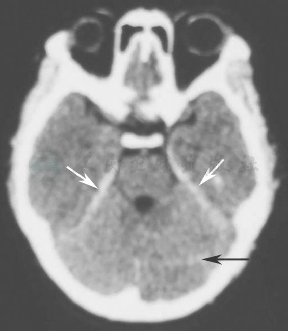 黑色箭头指示左侧小脑半球,白色箭头指示双侧小脑幕,均为高密度影,考虑存在蛛网膜下腔出血
