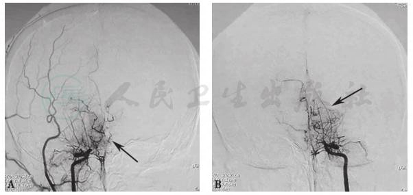 黑色箭头指示左右颈内动脉远端大脑中动脉和大脑前动脉近端闭塞,代之以烟雾状细小血管