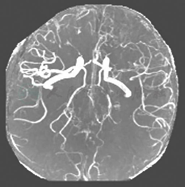 复查CRP、ESR较前上升,头颅MRA(图1)提示血管病变较前加重,考虑病情活动,建议应用TNF-α抑制剂,有助于控制病情发展并协助激素减量,患者及家属拒绝,遂予甲泼尼龙500mg×3d冲击治疗,后加强免疫抑制剂治疗,方案调整为醋酸泼尼松50mg qd+环磷酰胺600mg q2w+吗替麦考酚酯1750mg每天分为两次口服,并辅以降压、降糖、保肝等治疗,出院后患者糖皮质激素仍难以减量至35mg qd以下,减量后会再发头痛及下肢疼痛,伴有红细胞沉降率及CRP升高。