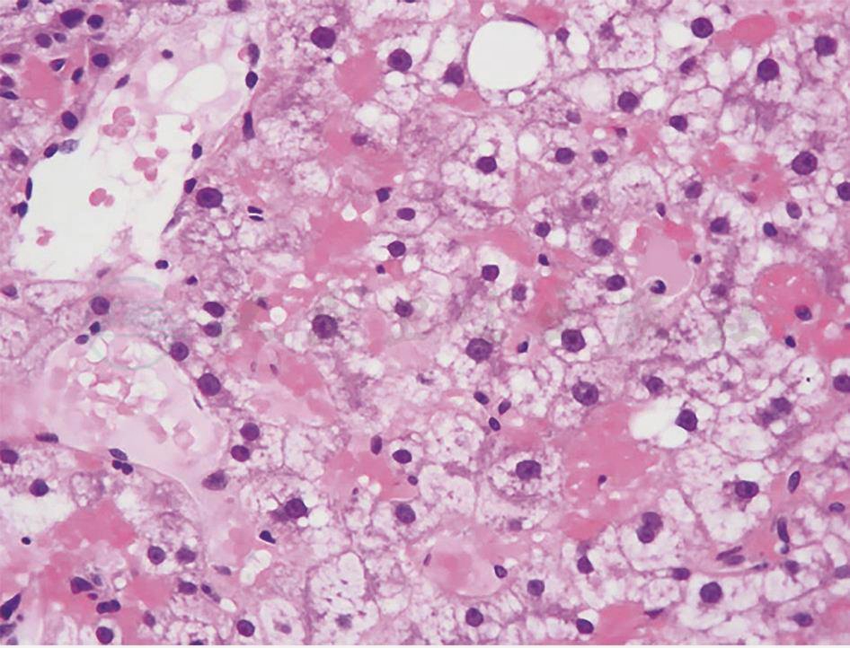 Ⅰ型糖原贮积病主要表现:①空腹低血糖,胰高血糖素治疗无效。②肝大。③高脂血症:高甘油三酯血症和高脂肪酸血症,可沉积于臀和四肢伸面形成黄瘤。④伴有酮症、乳酸性酸中毒、高尿酸血症。⑤肾脏受累,逐渐表现为蛋白尿、高血压和终末期肾病;由于肾脏糖原聚集,肾脏增大。⑥患者成年后多数身材矮小,代谢控制不佳者可出现单发或多发肝脏腺瘤、痛风、骨质疏松、尿石症等晚期并发症。这些症状均与本例患者相符。结合患者肝穿刺病理提示大量糖原沉积,PAS染色(+),因此该患者考虑诊断糖原贮积症(Ⅰ型)。进一步可行果糖或半乳糖转变为葡萄糖试验、葡萄糖-6-磷酸酶 (glucose-6-phosphatase,G-6Pase)活性测定及基因检查,与其他型进行鉴别。