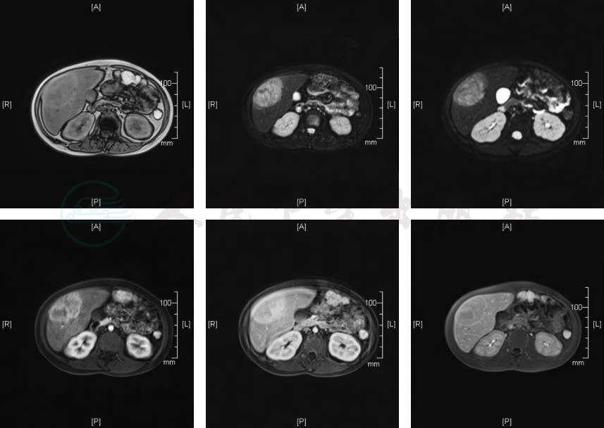 第一排从左到右依次是T1W1、T2W1、DWI;第二排从左到右依次是增强动脉期、增强门脉期、增强肝胆特异期。