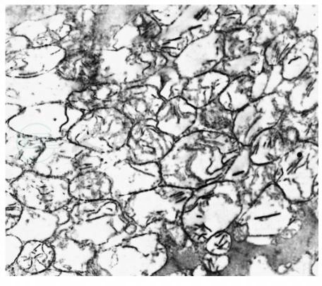 肌纤维略显肿胀,胞质淡染可见许多细小境界模糊的小空泡,肌原纤维隐约可辨。肌原纤维稀疏,空泡互相融合,胞核肿大,核仁明显,染色质周边化,呈空泡状,病变逐渐加重后,可发展为肌溶解坏死。
