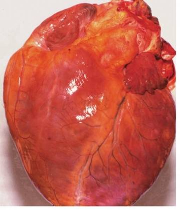 心肌病变以变性坏死为主,常见心内膜下心肌坏死,肉眼常表现为灰黄色片块状病变。心脏扩张及增重程度一般较轻,大体能保持心脏的原来外形。心肌瘢痕一般较少、较小。各脏器可见急性淤血、水肿及继发于休克的改变。