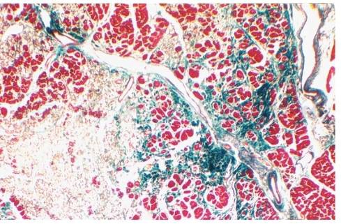 心肌损害成批发生,可以新旧并存(图3)。在心脏旧、新病变发生顺序通常是先左室、后右室,由内层向外层。在同一部位常见陈旧病变在中心,新鲜坏死在周边。北方地区的成人克山病这种新旧并存的现象相当多见,南方小儿亚急型病变多为一致性。坏死灶与冠状动脉走行密切相关,常见的有两种围血管坏死灶分布。