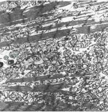 病变轻时,脂滴细小,排列整齐;严重时,脂滴粗大,肌原纤维及横纹不清。脂滴多呈灶状分布,且与局部心肌损伤严重程度相平行。在半超薄切片中,可见锇酸染色的脂滴整齐的出现于肌原纤维间。脂滴大小不等,直径为0.5~4μm,严重心肌脂肪变性多见于急型克山病病例。